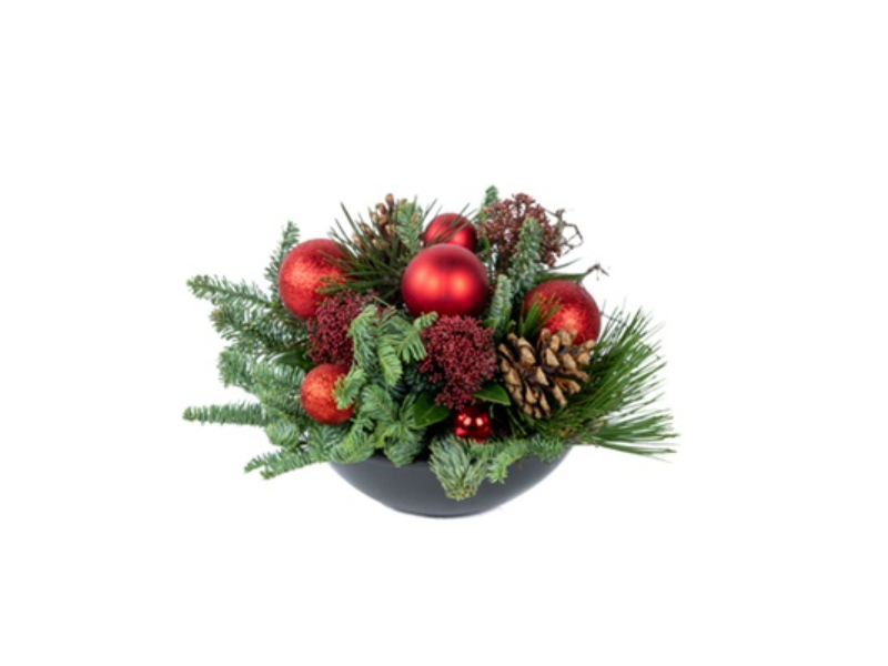 Dit elegante kerststuk combineert glanzende rode kerstballen, fris dennengroen en dennenappels.