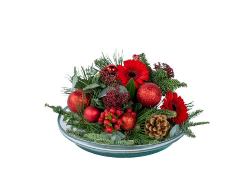 Dit elegante kerststuk, geplaatst op een glazen ondergrond, combineert glanzende rode kerstballen, fris dennengroen en dennenappels.