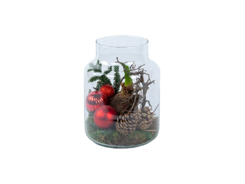 Breng warme kerstsfeer in huis met de "Amaryllis in glas Rood". De rode kerstballen, gecombineerd met mos, dennenappels en een elegante amaryllisbol, creëren een feestelijke en traditionele uitstraling. Perfect voor een sfeervolle toevoeging aan je kerstdecoratie.