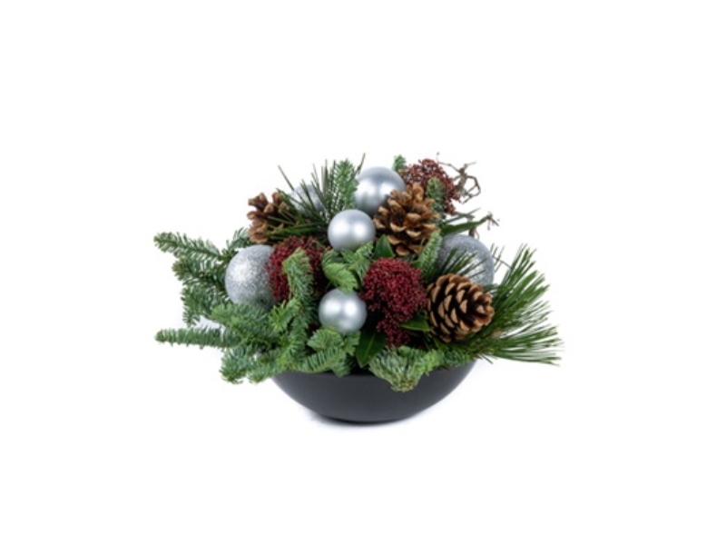 Geef je interieur een moderne en frisse uitstraling met de "Sparkling Christmas Silver". Dit kerststuk combineert zilveren kerstballen met dennengroen en dennenappels, en zorgt voor een sprankelend winterse sfeer in huis.